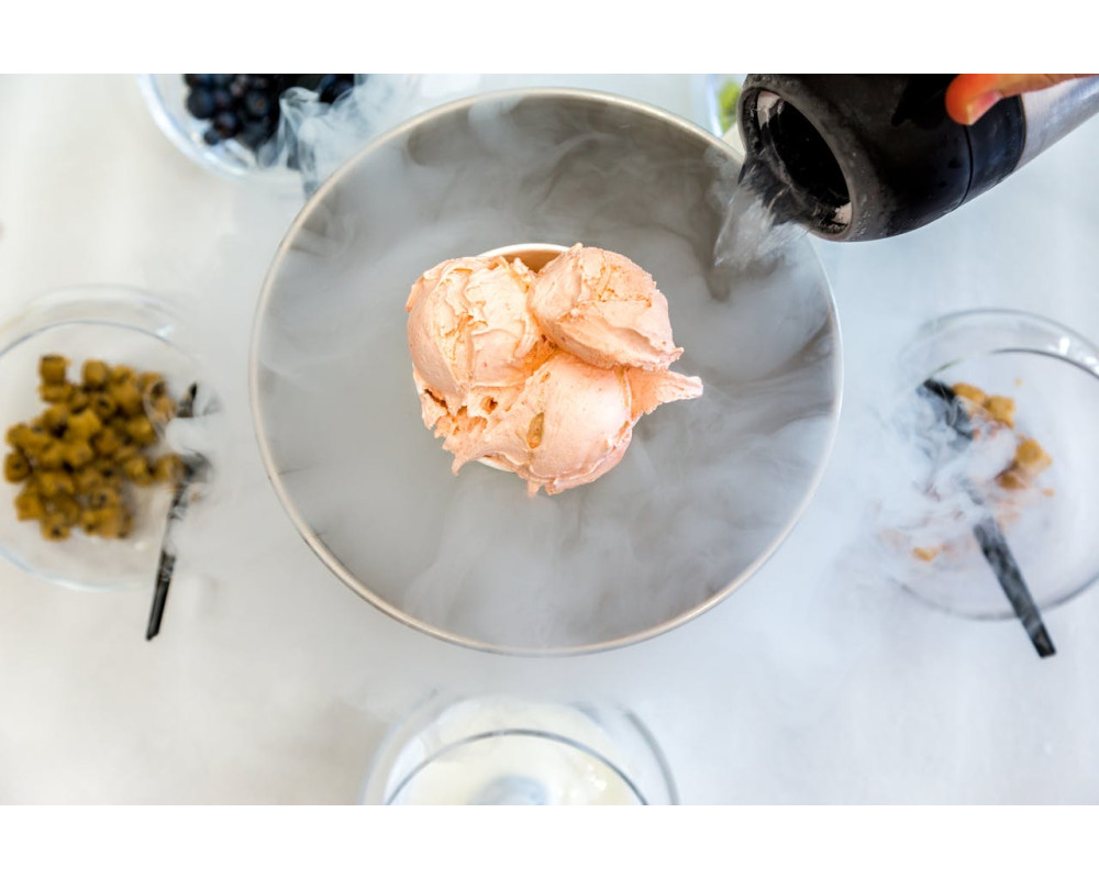 Carbonatation et préparation express d’aliments (glace, chocolat, boissons).